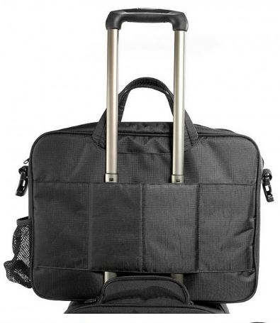 Extra's : Front compartment for Accessories. Side mesh pocket for water bottle. Ergonomic removable shoulder strap. Top carry handles. Slides over any trolley.