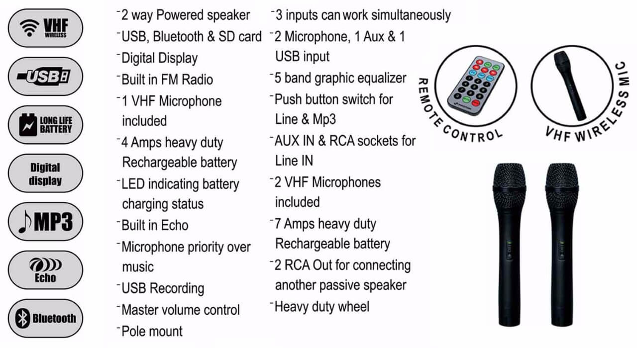 2 VHF cordless microphones with a range of over 50 feet are included in the package.