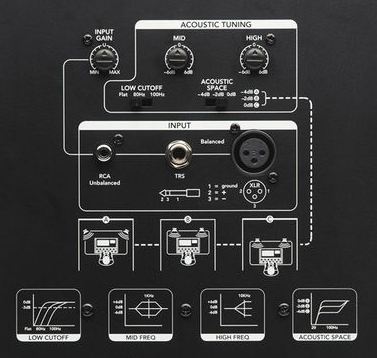 - Equalization : HF Control:- -6, 0, +6 dB; continuously variable; MF Control:- -6, 0, +6 dB; continuously variable; Low Cut Filter:- Flat, 80 Hz, 100 Hz; switchable; Acoustic Space Control:- Flat, -2 dB, -4 dB; switchable