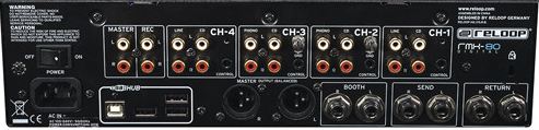 - Outputs: Master 1 XLR balanced, master 2 RCA unbalanced, rec, booth, send